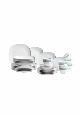 Das zeitlose und schlichte Porzellan von der Marke Mäser überzeugt durch seine feine Strichwelt in satten Blautönen Es wertet den Tisch besonders auf und lässt aber zugleich Platz für schöne Accessoires. Mit Enni haben Sie auch DAS Geschirr für jeden Tag – Mikrowellen- und Spülmaschinentauglichkeit sind zwei weitere Highlights, die für diese Serie sprechen. Dieses 30 teilige Geschirr-Set besteht aus: 6 x Kaffeeobere 200 ml 6 x Kaffeeuntere 15 cm 6 x Desserteller 19 cm 6 x Teller tief 21,5 cm 6 x Teller flach 25 cm