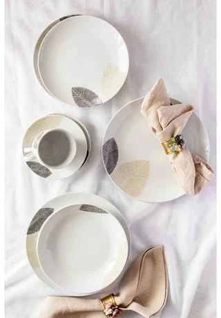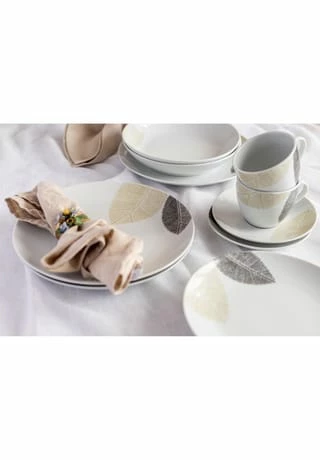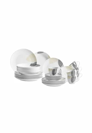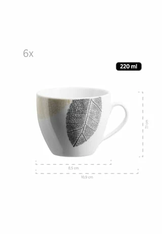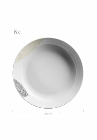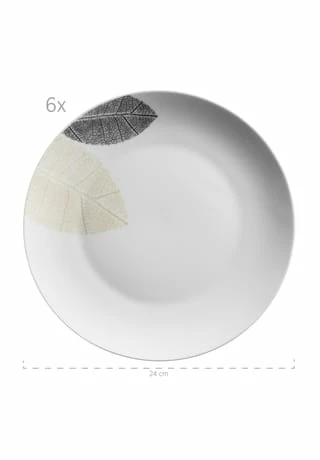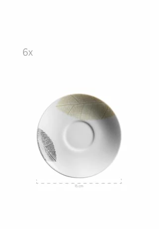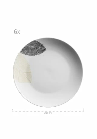 Die Porzellangeschirr-Serie JONA der österreichischen Traditionsmarke MÄSER präsentiert sich mit einem großflächigen, feingliedrigen Blätterdekor auf modernen randlosen Formen. Verspielt und dennoch elegant, klassisch und zugleich modern – die Schönheit dieser Kollektion ergibt sich aus der Verbindung von traditionellen und topaktuellen Design-Elementen. Dieses Kombiservice für 6 Personen bietet eine Ihnen solide Ausstattung für den Einsatz vom Frühstück über den Nachmittagskaffee bis hin zum dreigängigen Dinner. Alle Teile sind dauerhaft spülmaschinen- und mikrowellengeeignet, und dadurch äußerst pflegeleicht. Die in den Fotos angegebenen Füllmengen beziehen sich aus Gründen der Vergleichbarkeit auf eine Befüllung bis zum oberen Gefäßrand, bei den Abmessungen handelt es sich um Außenmaße. Dieses Geschirr-Set besteht aus 6 x Kaffeeobere 220 ml 6 x Kaffeeuntere 15 cm 6 x Dessertteller 20,5 cm 6 x Suppenteller 20,5 cm 6 x Essteller 24 cm