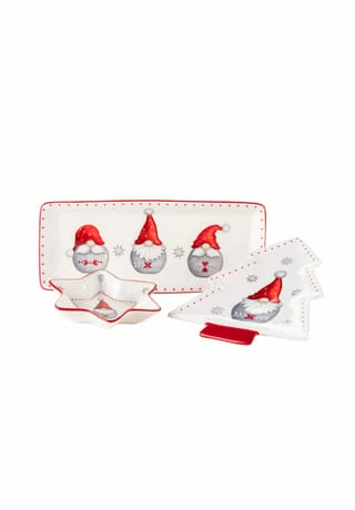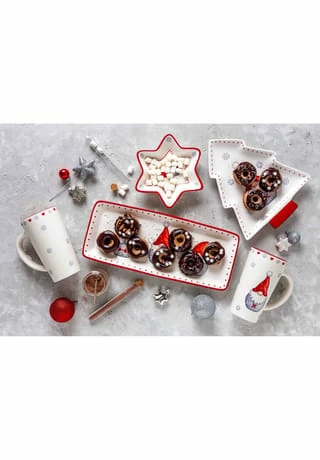 Dieses wunderschöne Weihnachtsgeschirr Set der Serie „Aurela“ ist das ideale Zubehör für die besinnliche Adventszeit und bringt die passende Weihnachtsatmosphäre nach Hause oder ins Büro. Verziert mit sympathischen Weihnachtsmotiven eignet sich dieses weihnachtliche Geschirrset perfekt, um im Advent langsam in Weihnachtsstimmung zu kommen und dazu passend Glühwein, Punsch, Plätzchen und Stollen zu servieren. Die verschiedenen Sets der Serie „Aurela“ (Weihnachtstassen-Set sowie Tellerset) lassen sich perfekt miteinander kombinieren. Alle Teile der Kollektion „Aurela“ der Traditionsmarke MÄSER sind aus klassischem Steingut gefertigt, weswegen wir Handwäsche empfehlen und von der Verwendung in der Mikrowelle abraten. Das Set wird in einer sorgfältig auf Bruchsicherheit getesteten Paketversand-Box aus reinem Karton versendet. Bitte beachten Sie: Für eine objektive Vergleichbarkeit gehen unsere Füllmengenangaben von einer randvollen Befüllung aus. Dieses Geschirr-Ste besteht aus: 1 x Platte 36 x15 cm 1 x Sternteller 17,5 cm 1 x Tannenbaumteller 26,8 cm